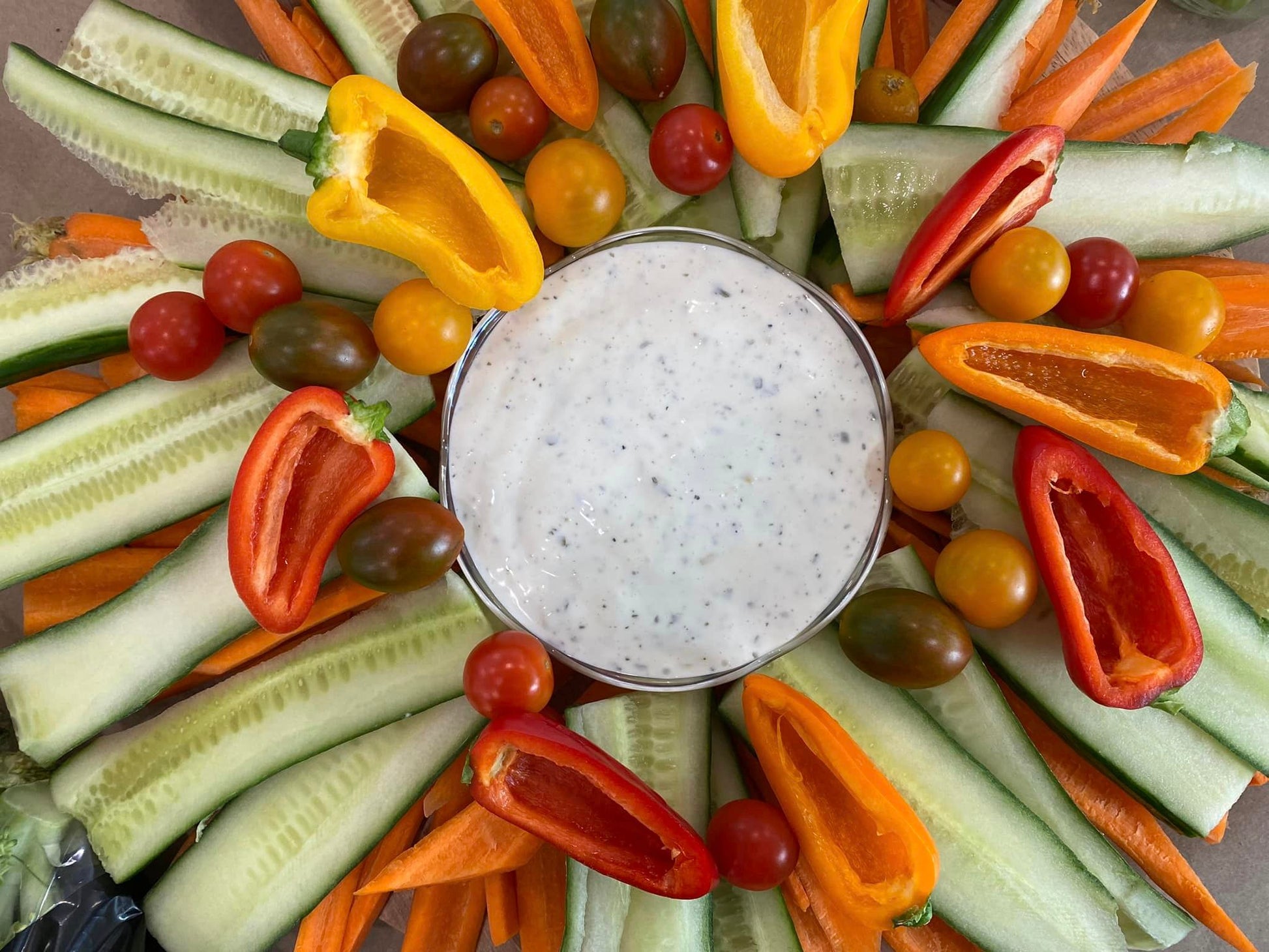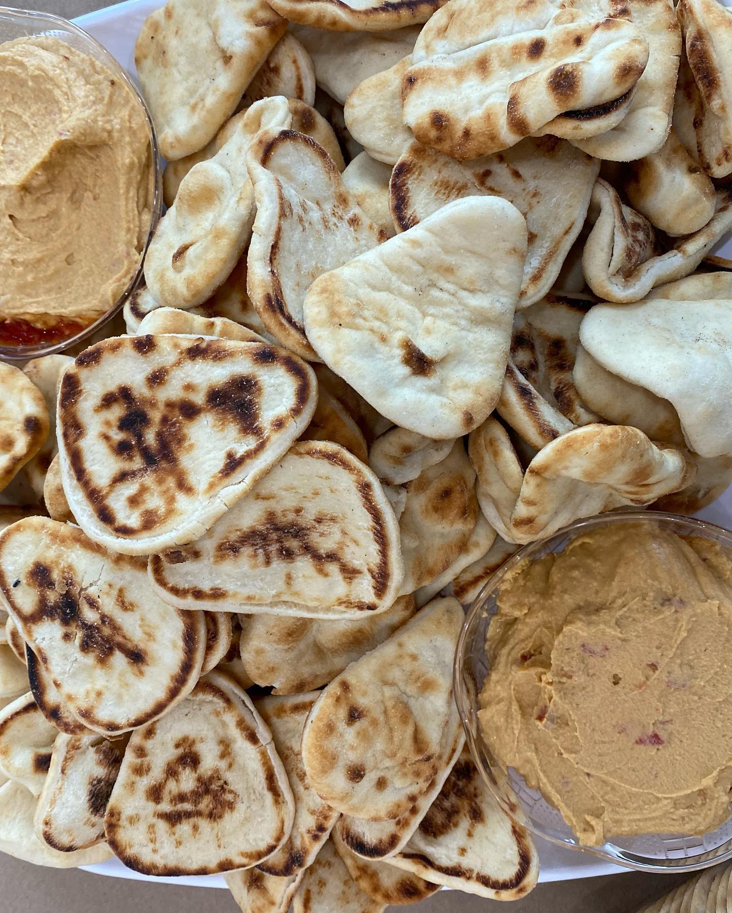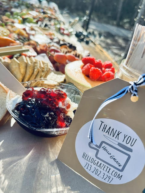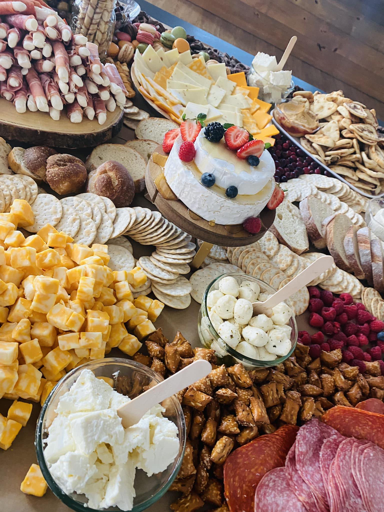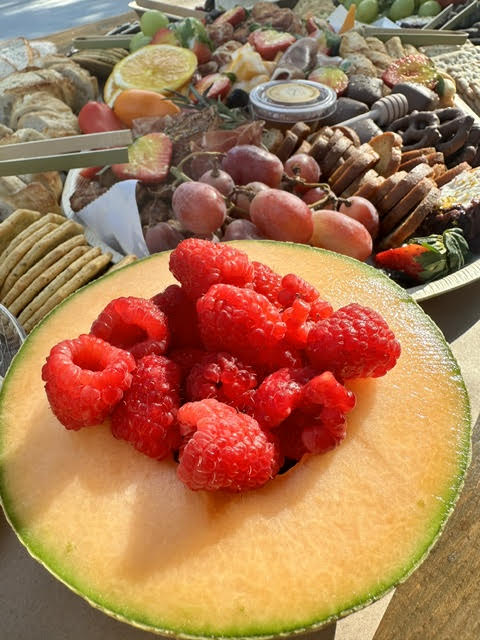 Every table we create is a one-of-a-kind masterpiece, uniquely designed to fit your event. No two tables are ever exactly alike! Each setup includes crackers, fresh bread, seasonal fruits, vibrant greenery, herbs, and edible flowers, ensuring a feast for both the eyes and the taste buds. All presentations are crafted on eco-friendly disposable kraft paper, and every table comes equipped with palm leaf boats, napkins, and disposable utensils for serving.
